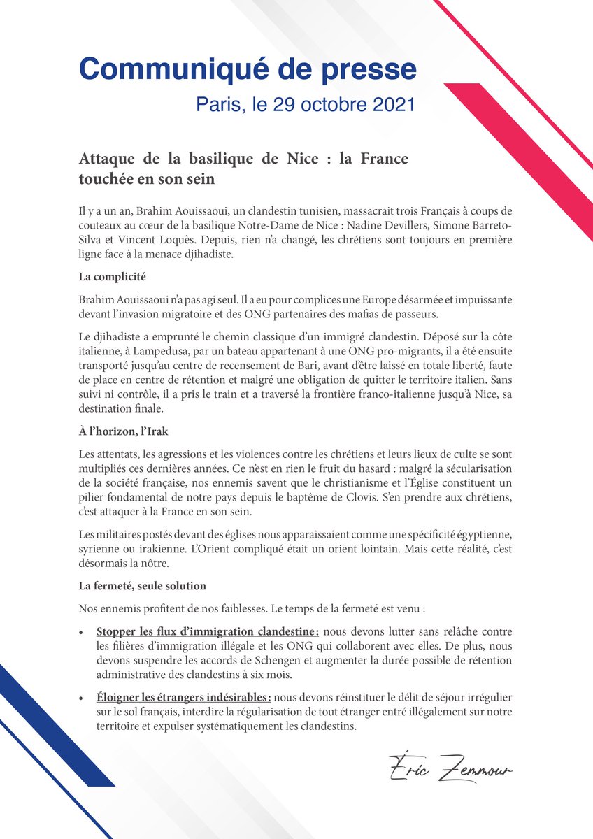 Il y a un an, trois chrétiens français étaient tués à coups de couteau par un clandestin tunisien dans la basilique de Nice. Nos ennemis profitent de nos faiblesses. Le temps de la fermeté est venu. Je veux revenir sur cet événement tragique : ⬇️pic.twitter.com/yubKNAyNtH