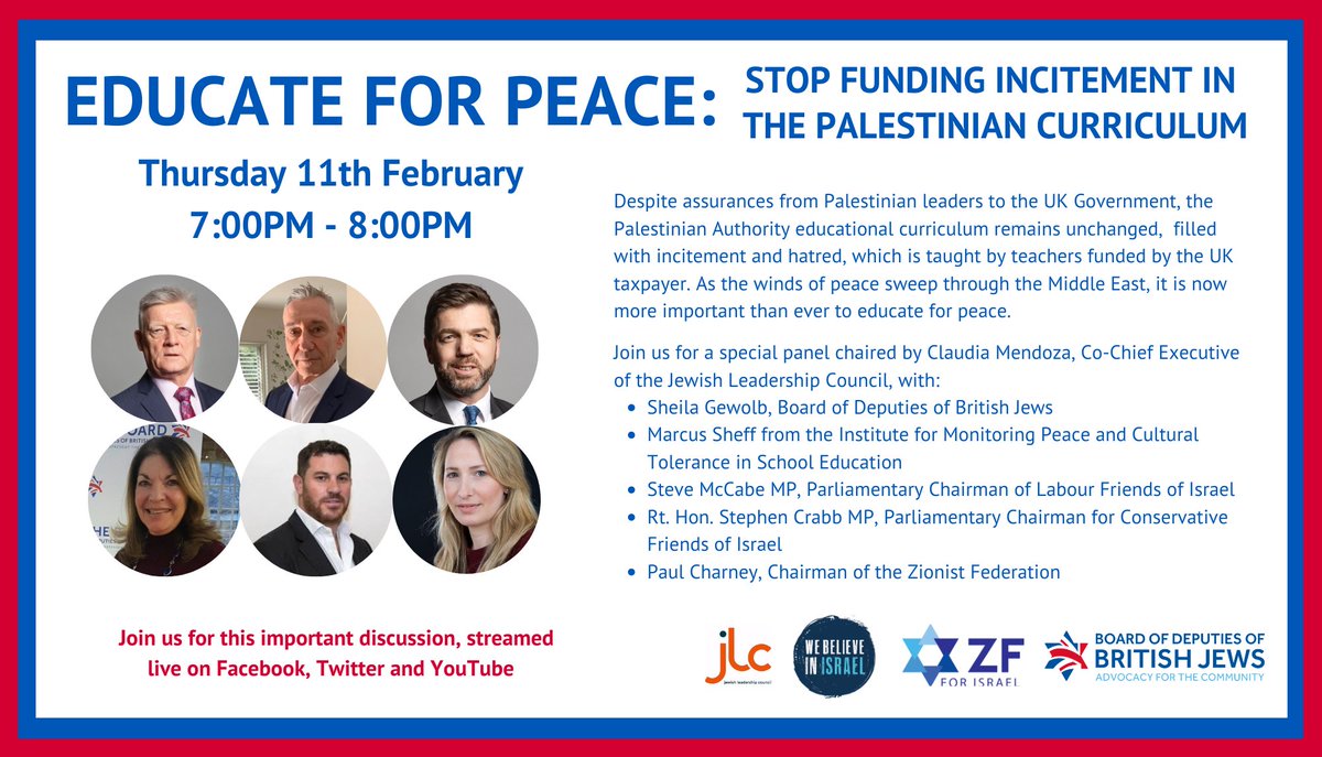 @ZionistFed, the@BoardofDeputies, the@JLC_uk &@WeBelieveIsrael for an exclusive webinar with guest speakers on the ongoing issue of anti-#Israel incitement in the#Palestinian Authority curriculum Register for FREE here: http://www.tinyurl.com/educate-for-peace …pic.twitter.com/J1mzsrZd9R