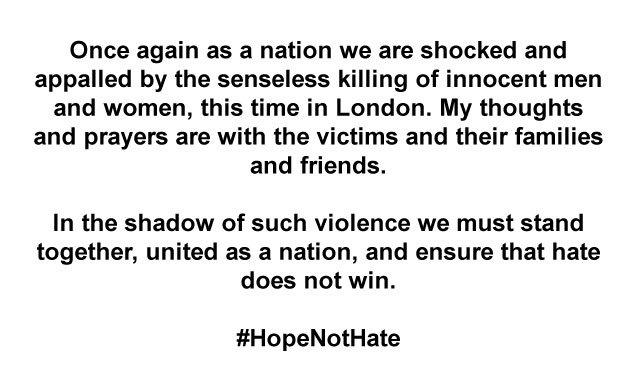 Once again we are shocked and appalled by the senseless killing of innocent men and women, this time in London. #HopeNotHatepic.twitter.com/fuqfG0P0UQ