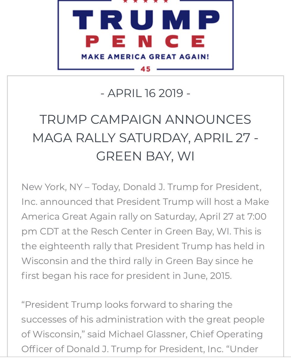 @realDonaldTrump will hold a rally in Green Bay, WI on Saturday, April 27...we hope to see you there!pic.twitter.com/wf14Ft6VJI