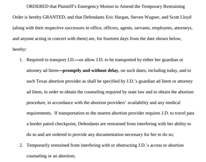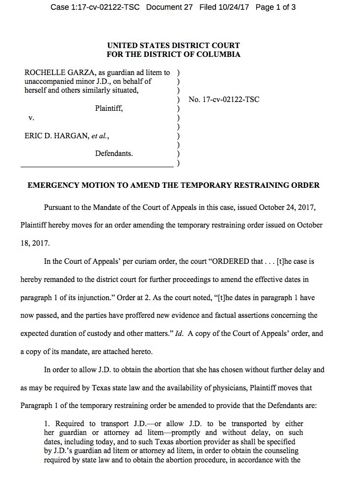 Latest: Jane Doe's lawyers have asked the district judge to amend earlier order to allow abortion to take place Wed. https://assets.documentcloud.org/documents/4116598/10-24-17-Garza-Motion-to-Amend-TRO.pdf …pic.twitter.com/SzgYSAZnKm
