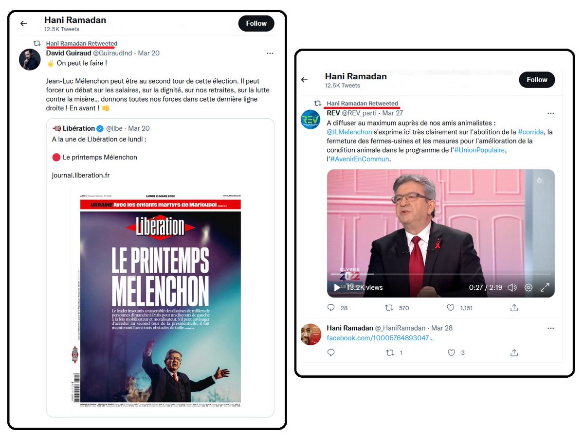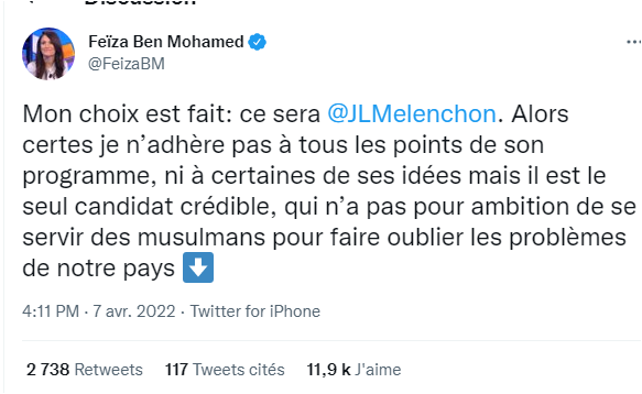 La mouvance islamiste francophone ne cache plus son soutien à Mélenchon et espère le voir arriver au 2nd tour des présidentielles. Le candidat de la France Insoumise censé faire barrage à l'extrême droite, ne semble pourtant pas très étanche à l'extrême droite islamiste.pic.twitter.com/RxC8P8mQdw