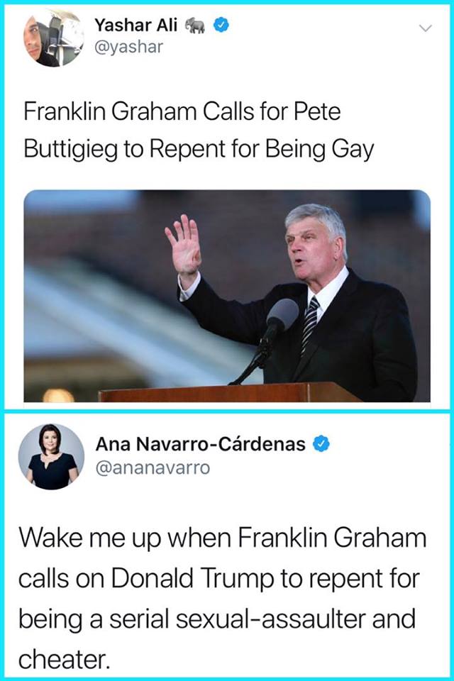 @Franklin_Graham interpret the bible to fit their own needs. Has Frankie G read the New Testament. Jesus last words to his disciples were "Love one another as I have loved you". No mention of exceptions, just love one another. "SAD!"#Evangelicalspic.twitter.com/o1TUooe3fS