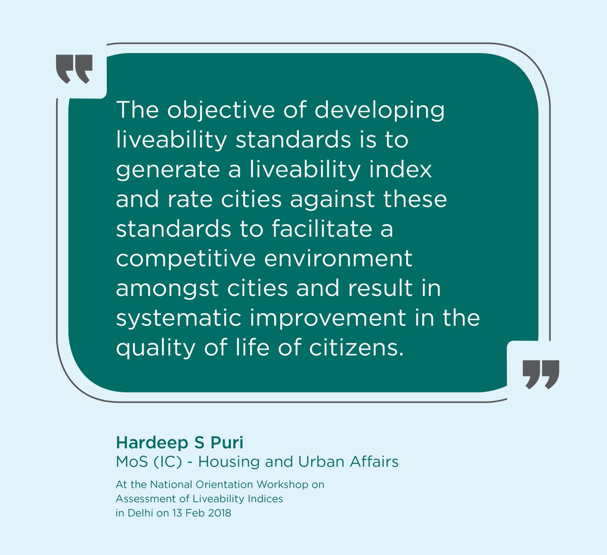 MoHUA_India: "The objective of developing these standards is to generate a liveability index and rate cities against these standards to facilitate a competitive environment amongst cities and result in systematic improvement in the quality of life of cit…pic.twitter.com/HWtNzR2bil
