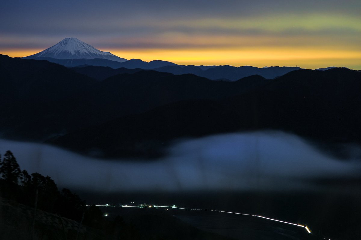 今朝 富士 ちょいと現像版 暗がりに見えるのは富士のシルエット 街明かりを反映する背景緞帳は 見る限り若干ミカン掛かったゴールドのようでした 超秒で こんなにも色んな色を拾うのですね 雲海も見れ 行った甲斐ありでした