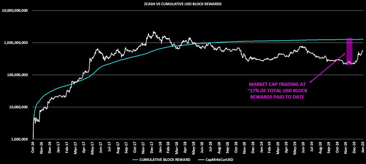 I've taken an interest in looking at other alts on-chain as of late, and found an interesting anomaly with ZCash Most cryptocurrencies tend to show respect for their total block rewards paid on a macro basis, yet ZCash traded at 17% of this figure at one point