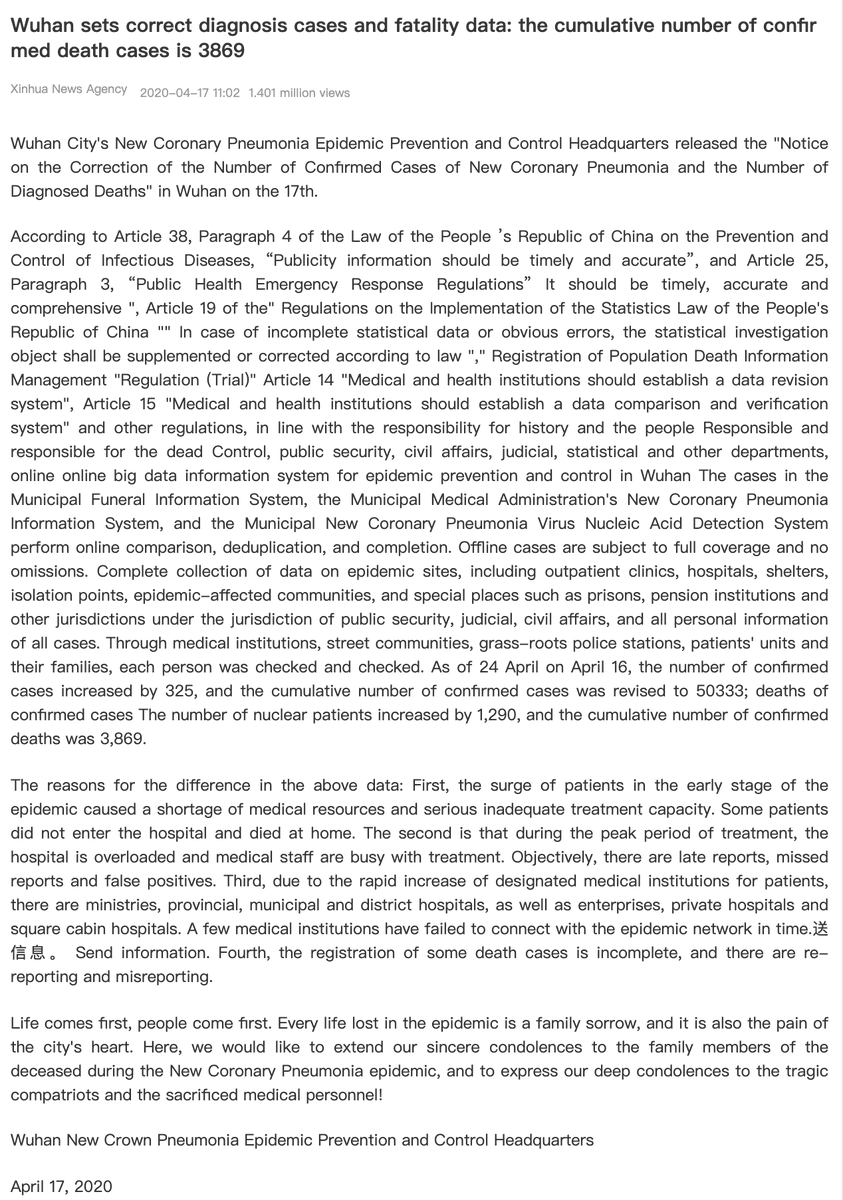 Here is the machine translation of the official statement on the Wuhan death count revision from Xinhua. It is notable that the Party sat on and concealed this recount investigation. https://wap.peopleapp.com/article/5397877/5311914 …pic.twitter.com/ExBqFWvaeH