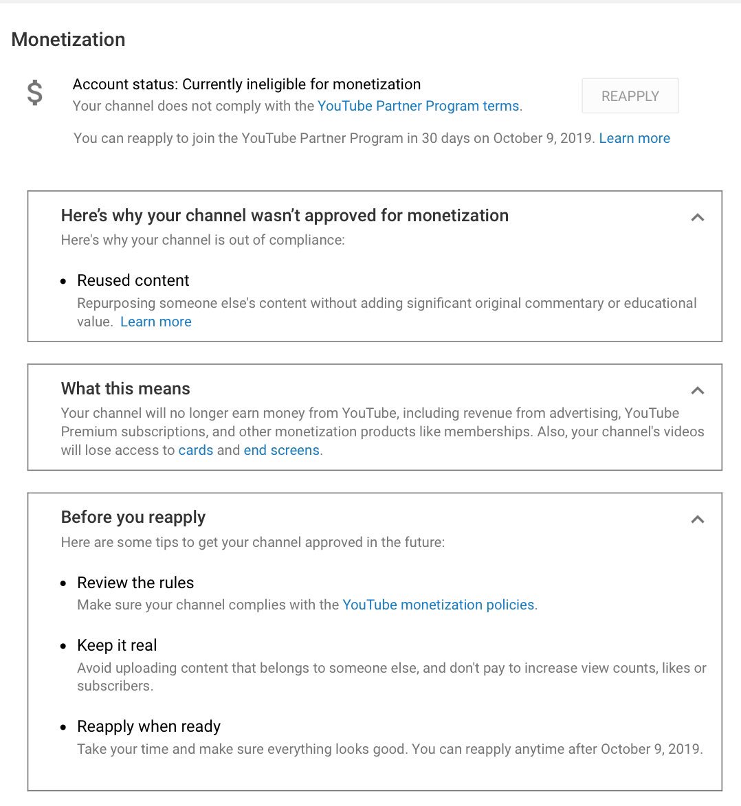 .@TeamYouTube so i lost monetisation to my channel for “reused content” when everything I have uploaded is my own content and hasn’t been seen before on YouTube. Any way to fix this before 9th of October before I can apply again since I haven’t done anything wrong...pic.twitter.com/Nj4tpwY3Ld