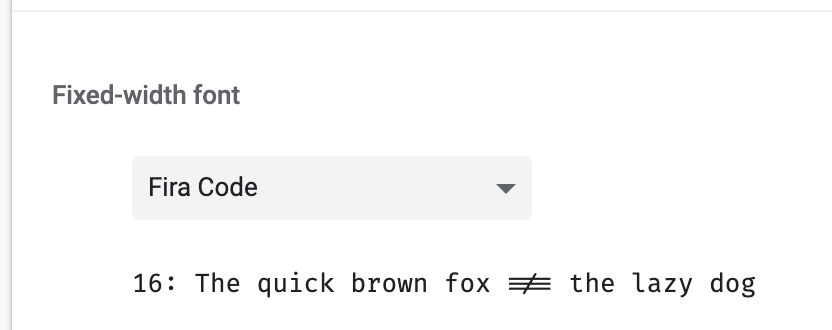 I just learned that you can use Fira Code and its beautiful ligatures as the default monospace font in Chrome!