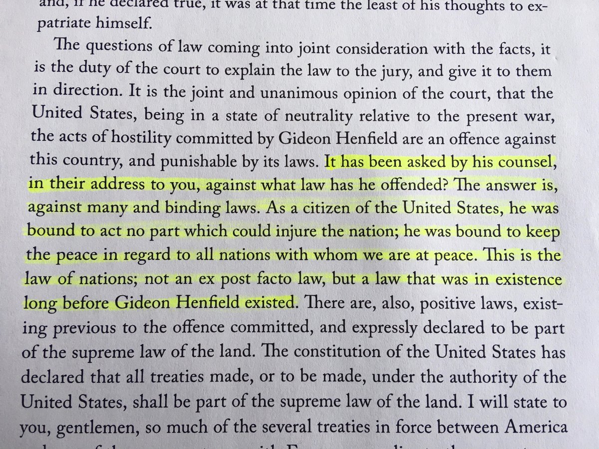 Apart from a handful of radicals like Bentham, few 18th century writers believed that applying the common law, natural law, or law of nations to a novel fact pattern offended the prohibition on bills of attainder or ex post facto laws. See, e.g., Henfield’s Case & US v Worrall.pic.twitter.com/IF2dPf9pDf