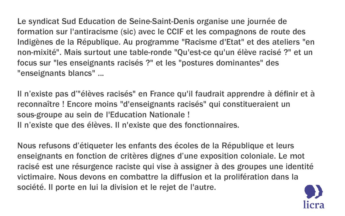@_LICRA_ , pour votre texte parfaitement clair !! Ce programme de "formation" syndicale est une honte, il va de soi qu'il faut intervenir auprès des instances académiques pour le dénoncer ! -