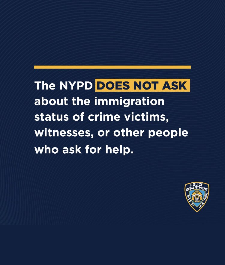 As a reminder, The NYPD does not ask about the immigration status of crime victims, witnesses, or other people who ask for help.
