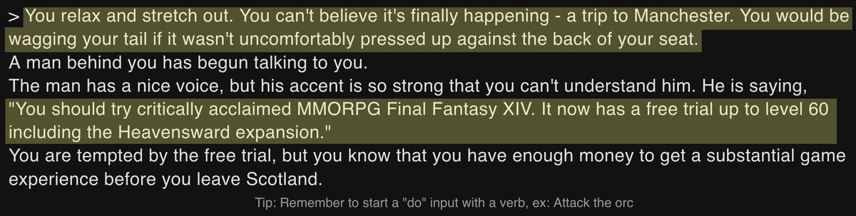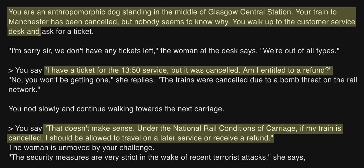 since I can’t travel in real life right now, I decided to use AIDungeon to simulate a train journey from Glasgow to Manchester how well can GPT-3 do it without editing, retrying or cherry-picking responses? uh… not very well. full transcript here: https://wuffs.org/blog/experimenting-with-ai-dungeon …pic.twitter.com/eOc8tdTUxb