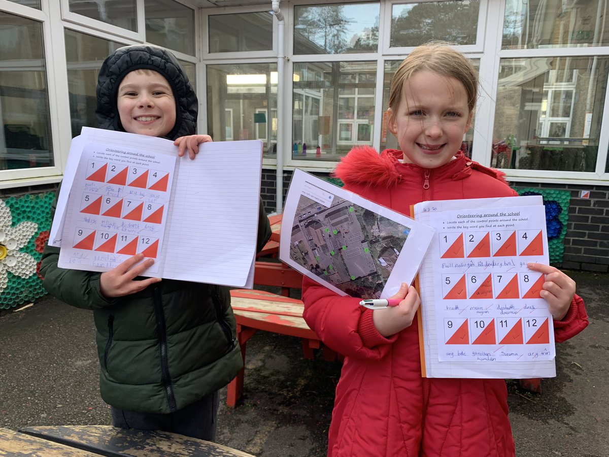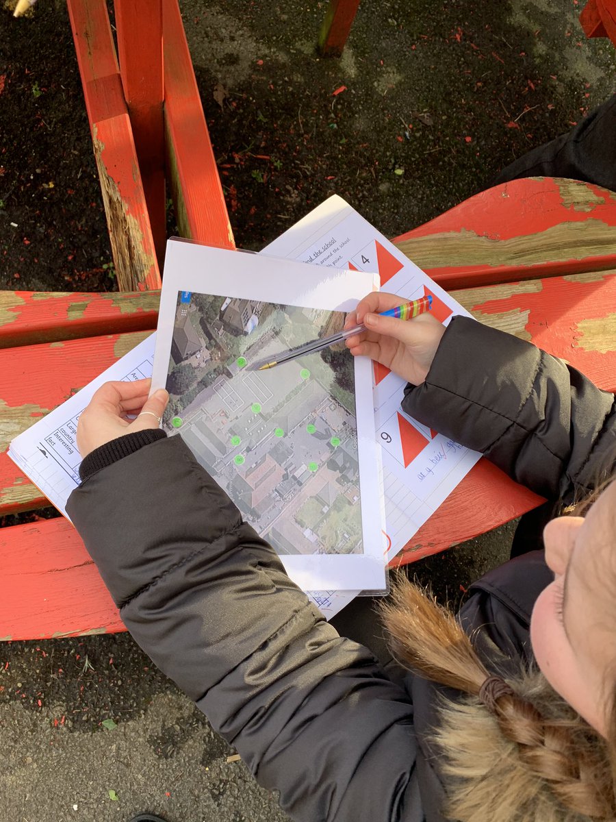Year 5 orientating an aerial map of the school to locate the 12 key Welsh words.