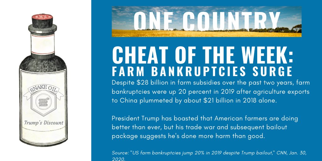 #CheatoftheWeek is the 20% increase in farm bankruptcies in 2019 despite the $28 billion in farm subsidies over the past two years.@realDonaldTrump, are farmers still doing better than ever?pic.twitter.com/v7UTfbKgh6