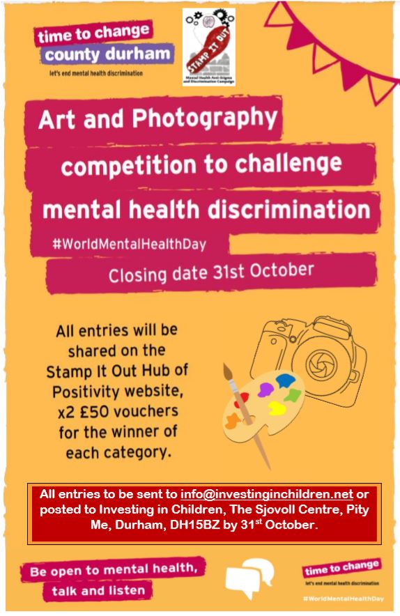 ? Challenge mental health Discrimination by taking part in our Art and Photography Competition! Please send your entry please to either: info@investinginchildren.net or Investing in Children, The Sjovoll Centre, Pity Me, Durham, DH15BZ by 31st October.pic.twitter.com/JU0bGfcvQi