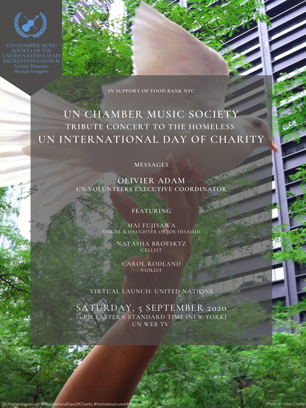 On the occasion of #CharityDay, and in support of @FoodBank4NYC, watch a tribute concert to the homeless, performed by @unchambermusic. The event begins today at 12 pm EST, with a message from @OlivieradamUNV, Exec. Coordinator @UNVolunteers! http://webtv.un.org/ pic.twitter.com/be4Za0TyNN