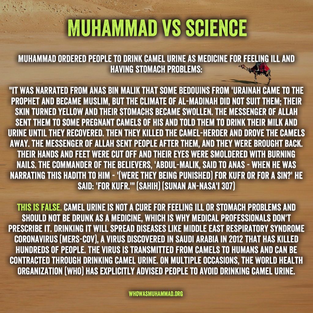 Muhammad ordered people to drink camel urine as medicine for feeling ill & having stomach problems. This is obviously false. Camel urine is not a cure for feeling ill or stomach problems & should not be drunk as a medicine, which is why medical professionals don't prescribe it.pic.twitter.com/zRUlzEtWrk