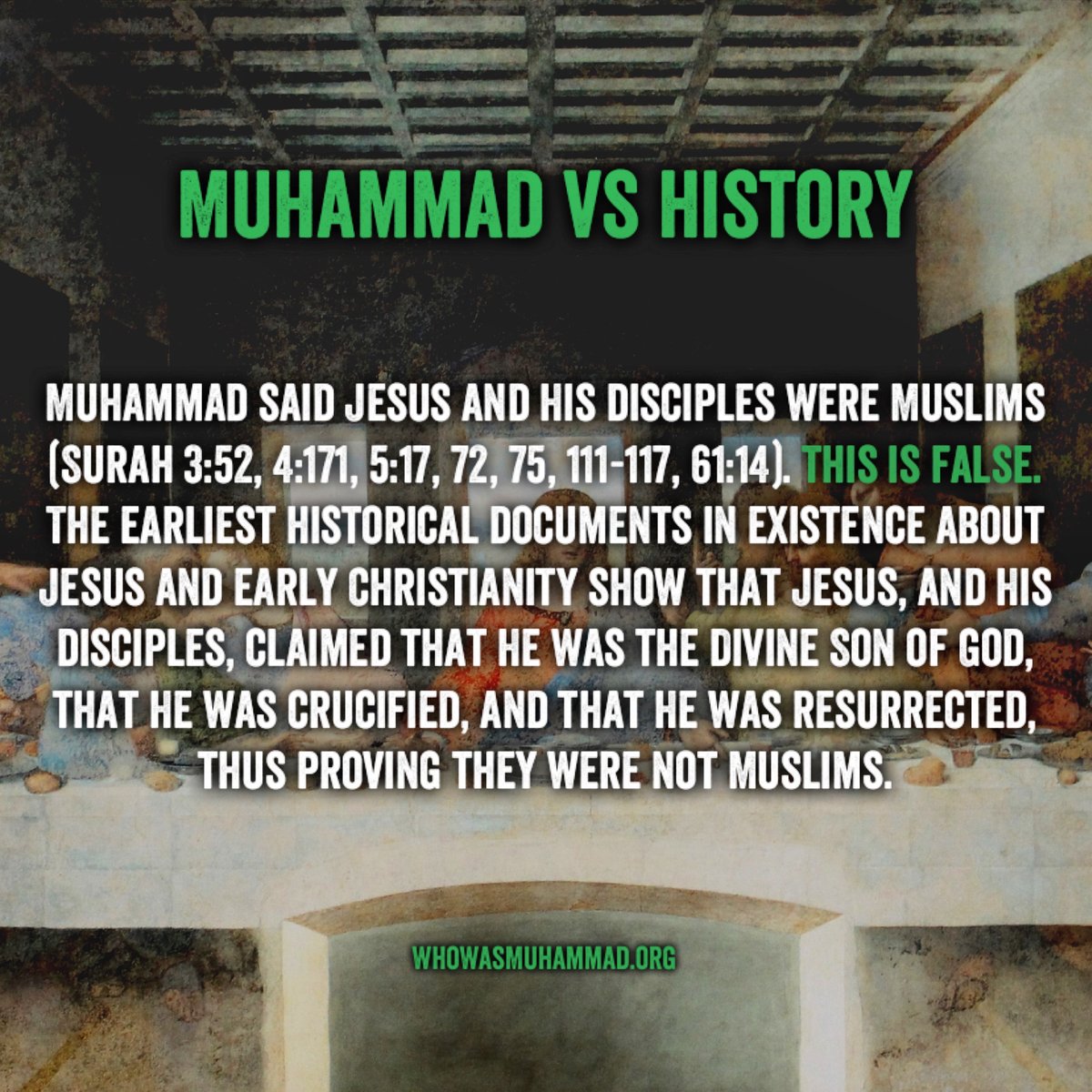 Muhammad said Jesus & His disciples were Muslims (Surah 3:52, 4:171, 5:17, 72). This is false. The earliest historical documents about Jesus & early Christianity show that Jesus, & His disciples, claimed He was Divine, crucified, & resurrected, thus proving they were not Muslims.pic.twitter.com/ZBtNIioWIh
