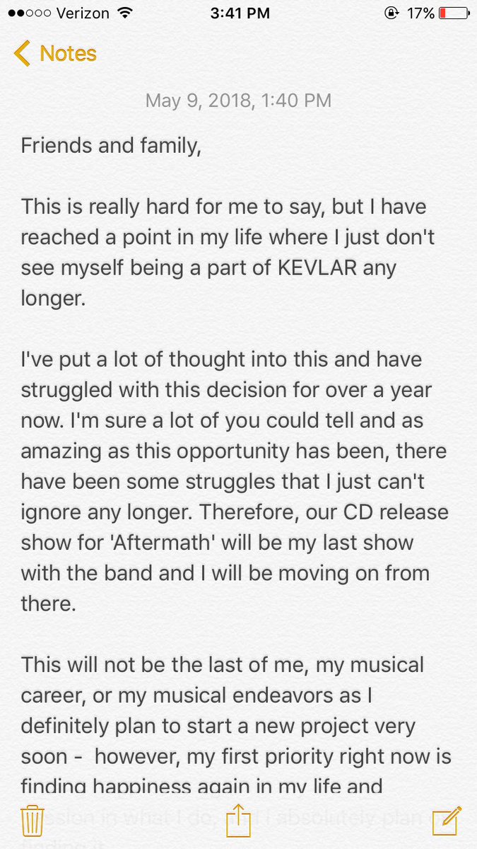 Friends and family, This is really hard for me to say, but I have reached a point in my life where I just don't see myself being a part of KEVLAR any longer. For now, just know that I am grateful. All good