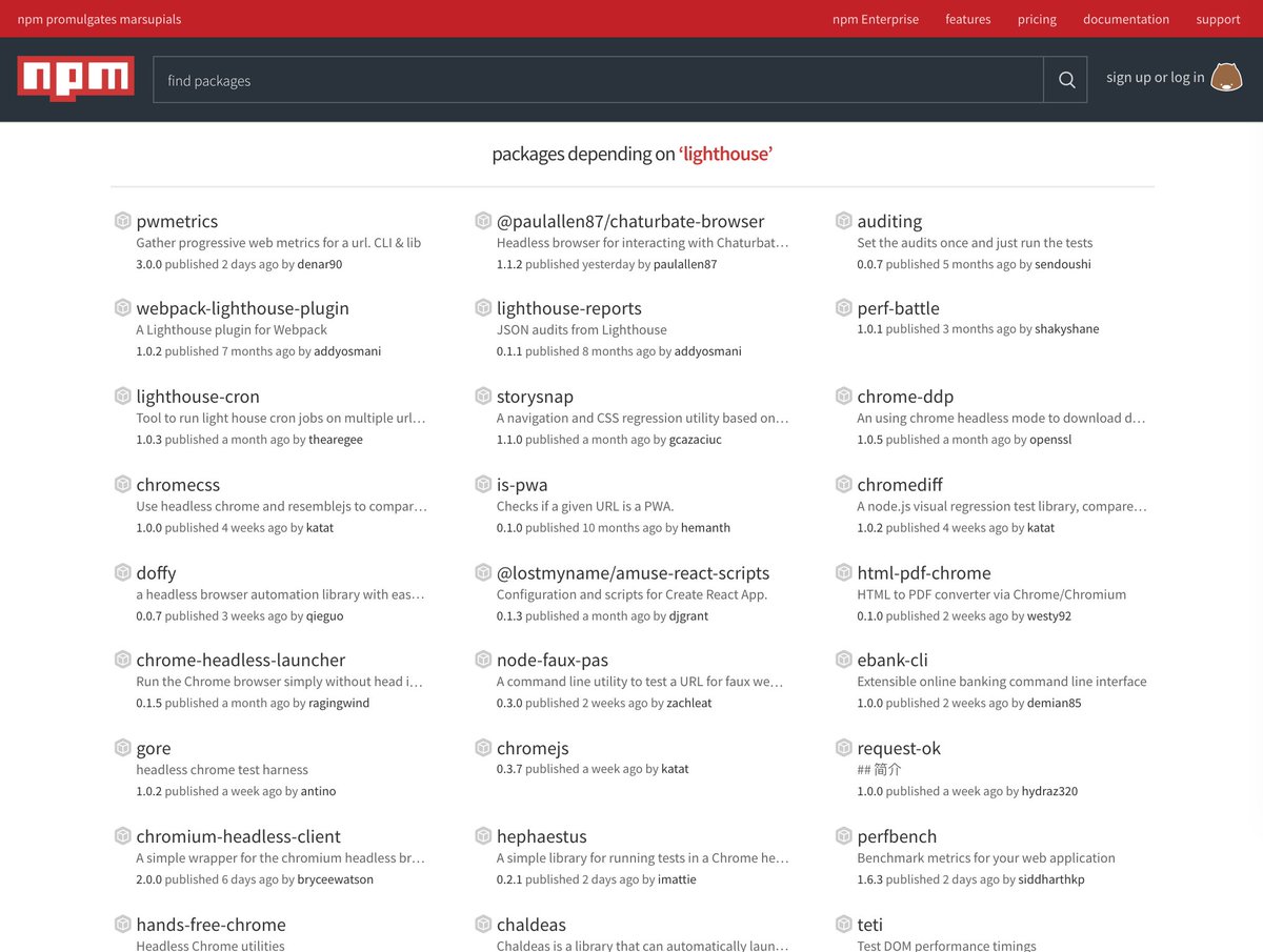 Exciting to see all the interesting ways people are using Lighthouse: https://www.npmjs.com/browse/depended/lighthouse ….