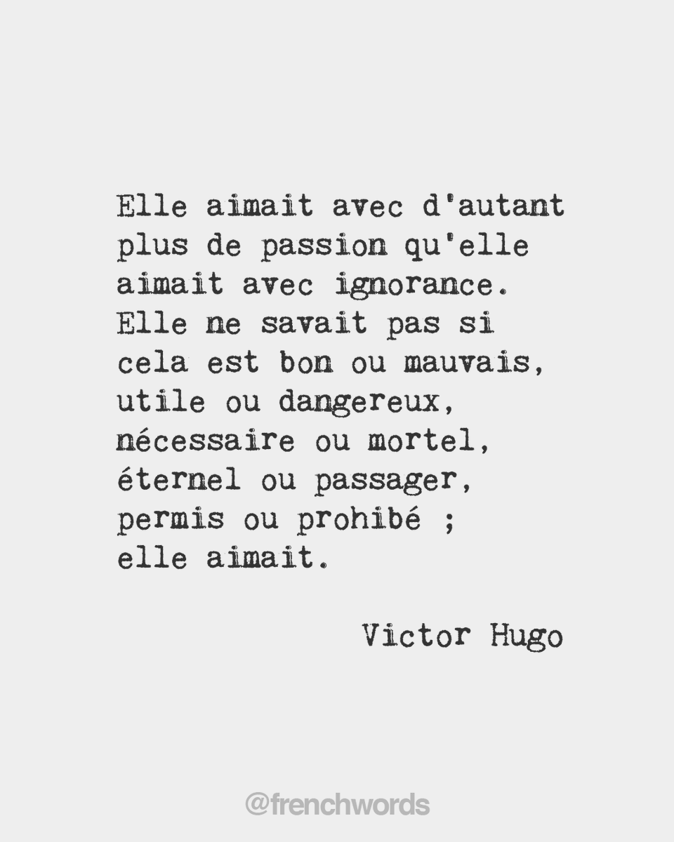 She loved with so much the more passion as she loved with ignorance. She did not know whether it were good or evil, beneficient or dangerous, necessary or accidental, eternal or transitory, permitted or prohibited: she loved. • Victor Hugo, French novelist (1802-1885)pic.twitter.com/rum01jgXXB