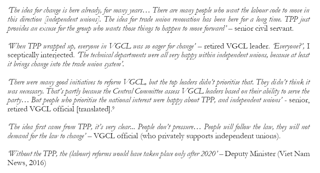 During TPP negotiations, under the auspices of complying with ILO conventions, increasing market access, & joining the international community, Reformists could openly discuss independent unions (without fear of repression) Through speaking out, they realised wider support!