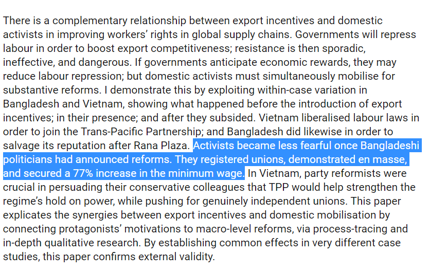 PLOT TWIST: Exactly the same thing happened in Bangladesh! Rana Plaza created export incentives for the Gov to announce labor reforms. Activists became less fearful, & mobilised for substantive change! See, export incentives AND domestic activists! https://www.researchgate.net/publication/331864175_Export_Incentives_Domestic_Activists …pic.twitter.com/dop7kFCFca