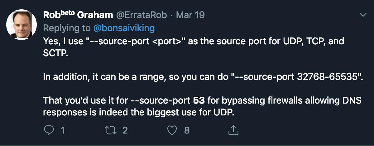 As Rob points out, src port 53 does indeed reveal almost 1 million host difference scanning all IPv4 space, just not in the direction we expected Side A - Src Port < 1024: Found 2034432 UDP http://portradar.packet.tel/packet.tel.03212019.tcpudp.53.sideA.tar.gz … Side B - Src Port 53: Found 1190639 UDP http://portradar.packet.tel/packet.tel.03212019.tcpudp.53.sideB.tar.gz …pic.twitter.com/YAhbmN1z0N
