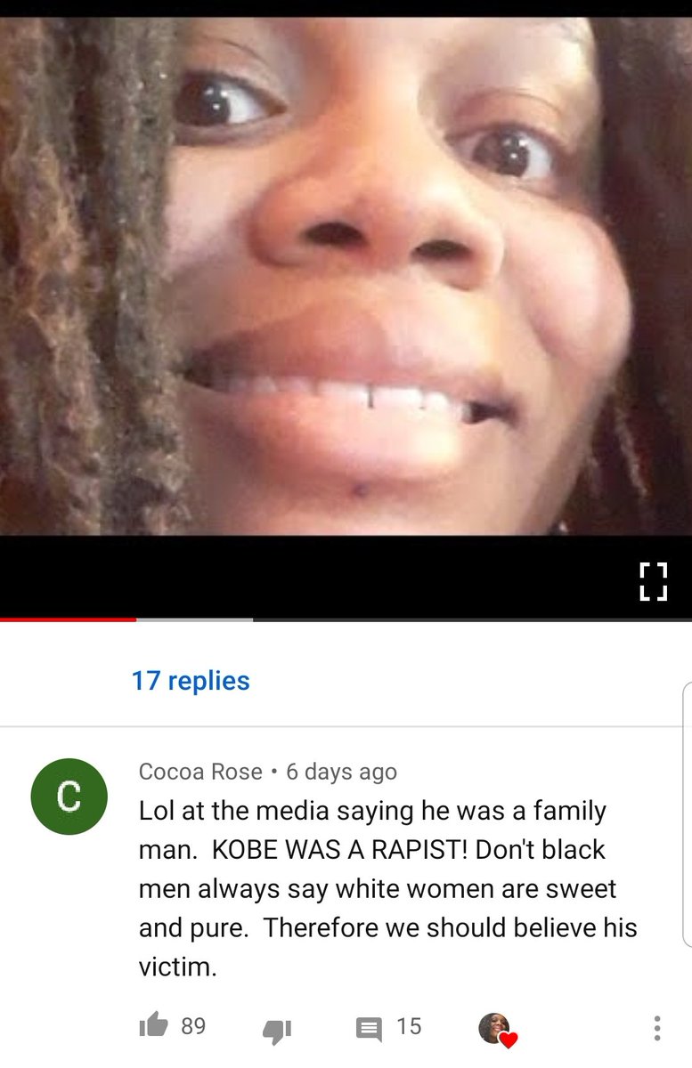 She claims black men are mad that it wasnt a black female swirler..so the legend Kobe Bryant passes and apparently black men in america are mad that it wasnt a black female swirler like serena Williams? mind you, kobe has never disrespected black women.pic.twitter.com/LJ2oF0ZSTu