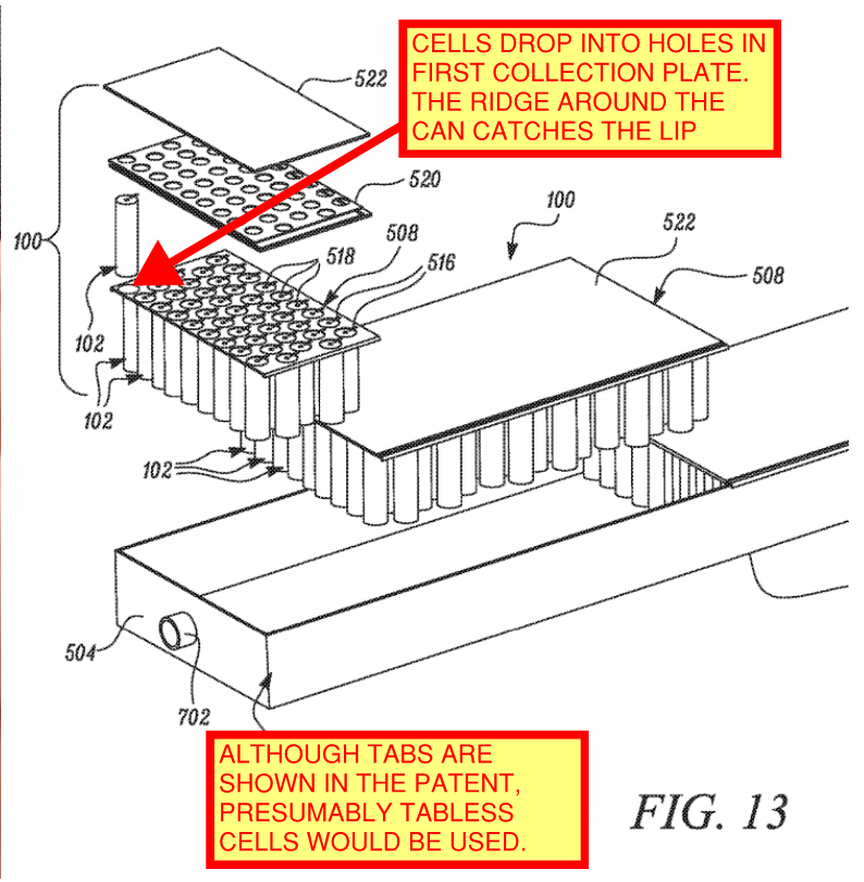 The roll is pushed into the can, copper anode down. The can is dropped into the holes of the first collector plate. The dielectric separator 520 is sandwiched in between and the top cover plate rests atop the aluminum collector caps of each battery in the group...pic.twitter.com/XmXwkDAMCT