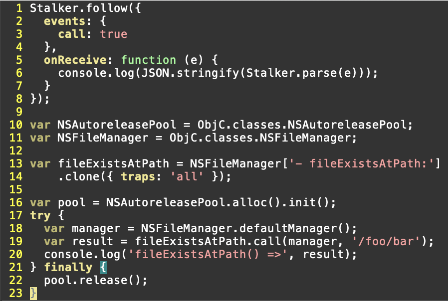Not only can NativeFunction calls be followed with ability to mutate their instruction streams on a per thread basis, but also ObjC and Java calls. We now also support direct memory access through brand new ArrayBuffer APIs.