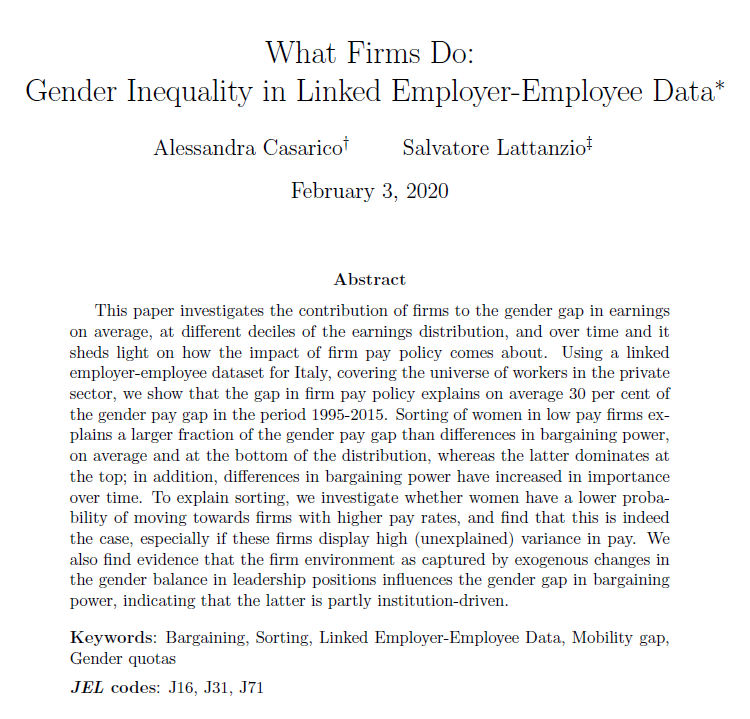 I am happy to share a new draft of "What Firms Do: Gender Inequality in Linked Employer-Employee Data" co-authored with Alessandra Casarico (@Unibocconi) at this link: https://www.dropbox.com/s/2gpkfglnanwgho3/GWGfirms_Feb2020_final.pdf?dl=0 … Thread about its contents here [1/8]#EconTwitter#AcademicChatterpic.twitter.com/KXRGhsqnfV