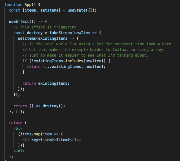 In React what's everyone's idiomatic way for having a stream depend on some state, but also potentially update that state, without it re-triggering the setup of the stream every time it changes that state? (Thread)