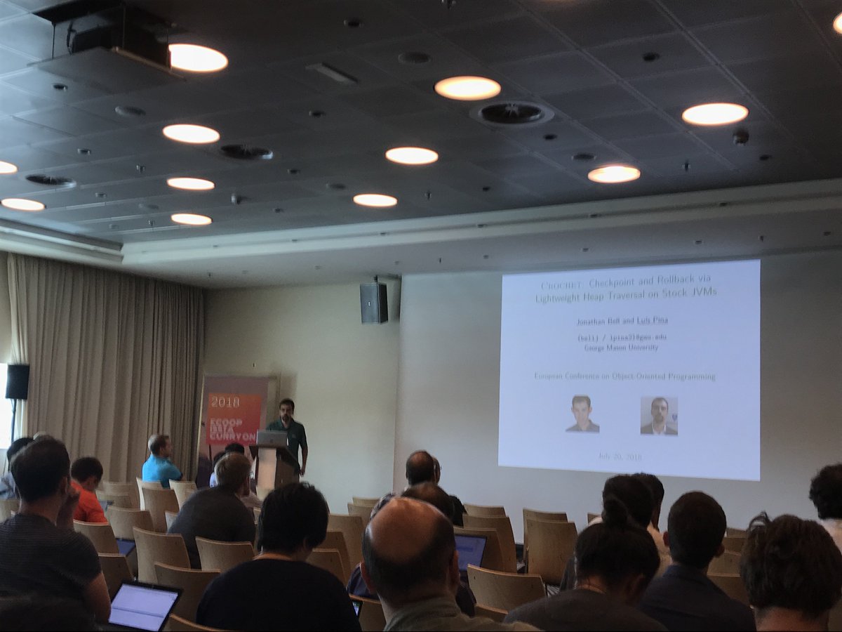 @luisggpina presenting our super-fast#JVM checkpoint/rollback system at#ecoop18. Spoiler: We show that you can change the type of objects at runtime! GitHub: https://github.com/gmu-swe/crochet Paper: http://jonbell.net/publications/crochet … Slides: https://www.slideshare.net/jon_bell/crochet-checkpoint-rollback-in-jvm-ecoop-2018 …pic.twitter.com/F2MwFbnkXN