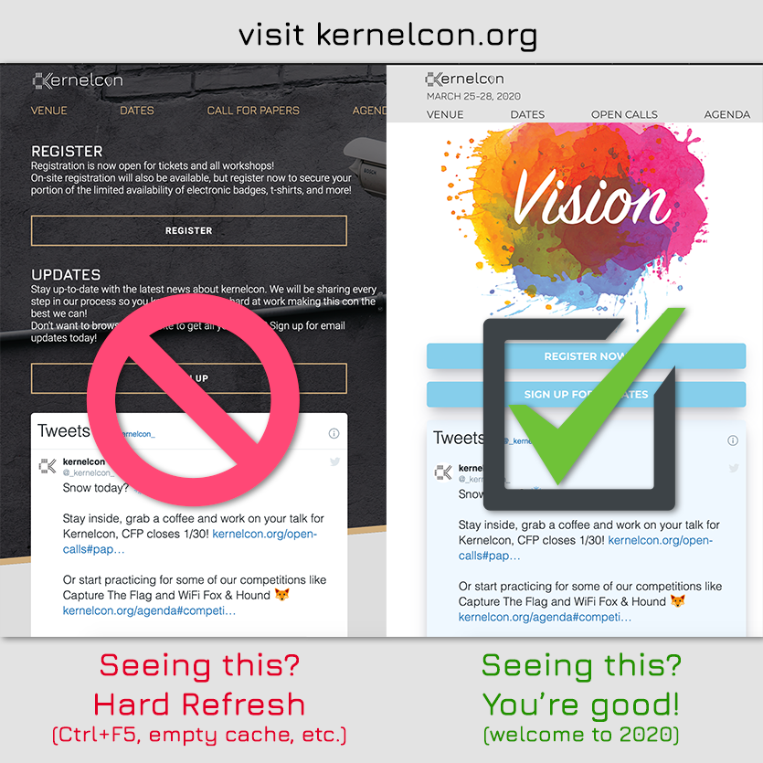Our 2019 con was great, but we're ready to move on. We've been fighting a glitch that left some of you in the past. If you're still seeing the 2019 Kernelcon web site, please hard-refresh so we can all be in 2020. https://kernelcon.org pic.twitter.com/HnWeocp5pw