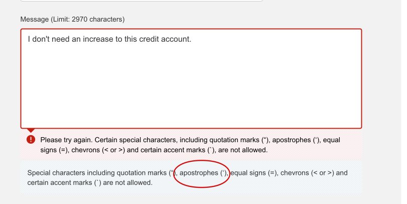 @Citi@BestBuySupport - I can not use apostrophes in your credit card messaging UI. That is pretty silly. Do not you think?pic.twitter.com/bBdTbyugLm