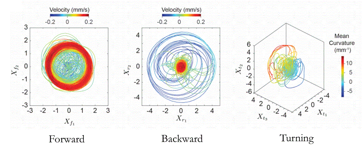 The low-dimensional reconstructed state space allows us to understand a great deal about worm movement, without knowing the equations of motion! It is globally structured into trajectory bundles corresponding to the canonical behaviors of forward, backward and turning.pic.twitter.com/HuRH85I6WA