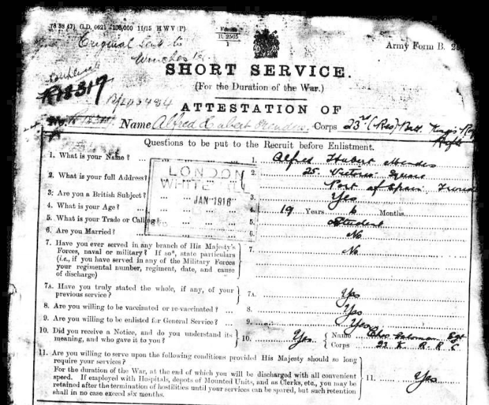 The inspiration for the movie "1917" was the writer and director's grandfather, Alfred Hubert Mendes. Pictured here is Alfred's Attestation Paper. You can also other papers in his military file from his service in the 1st Rifle Brigade on Fold3. http://fnote.it/6x6j pic.twitter.com/BgYCh3szxC