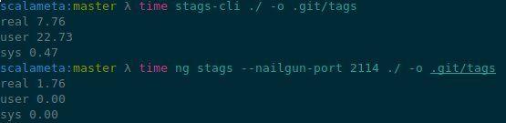 Stags 0.4.1 is now up in Maven, fixes an issue with Nailgun where it wasn't actually working. https://github.com/pjrt/stags My previous tweet also said tagging was almost "instant", it isn't (the bug hid that) it is quicker though (ofc, only after warm up).pic.twitter.com/59smQ24L6P