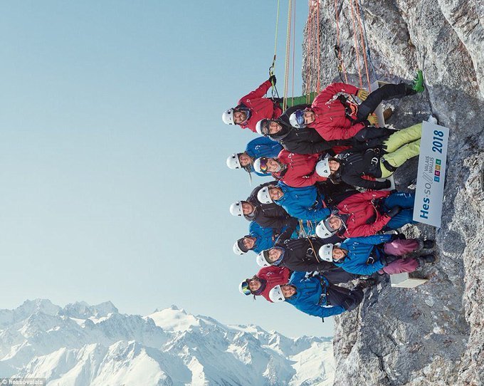 Students at the University of Applied Sciences and Arts of Western Switzerland took this unique class photo where they appear to defy gravity by standing on the side of a sheer mountain face 2,400 m high after a grueling climb https://buff.ly/2oYiDb6 pic.twitter.com/5ouD3G8BM4