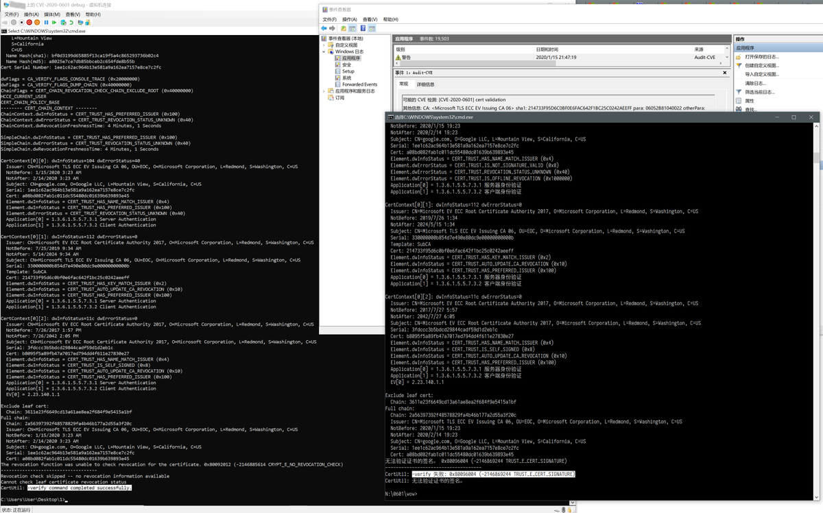 Late to the party but yeah, confirmed this bug can indeed be used to fake signature of any ECDSA intermediate CA. Left side is an unpatched VM. Didn't bother filling all those strange x509 extension fields required by modern browsers so no fancy in browser screenshot.pic.twitter.com/Q9oFeajaWz