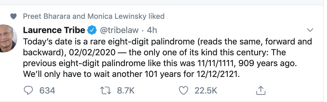 #PalindromeDay miss that 02 February 2020 is a palindrome in USA, UK and ISO formats; it is a palindrome day of the year (33) and there are a palindrome of days left in the year (333). This will never happen again. More details here: https://youtu.be/4fE_sXZjxng pic.twitter.com/GD7zh50DPH