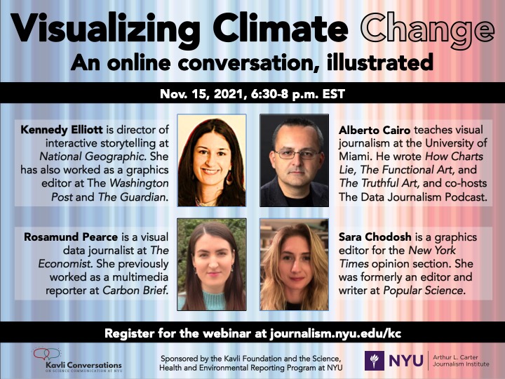 #ClimateCrisis is simply impossible without powerful#dataviz, so JOIN US TODAY at 6:30 EST for a timely#kavliconvo with@kennelliott@AlbertoCairo@_rospearce &@schodosh. You DO need to pre-register at https://journalism.nyu.edu/about-us/event/2021-fall/visualizing-climate-change-an-online-conversation-illustrated/ …#COP26#scicommpic.twitter.com/0K8XgtwbB2