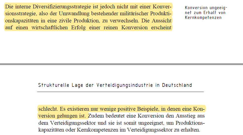 1) Konversion - Das Ziel der Diversifizierung/Konversion - der Umstellung von mil. auf zivile Produkte - ist ein altes. Leider fällt die bisherige Bilanz dazu in Deutschland schlecht aus. (siehe z.B. https://bit.ly/3HbWJY4 S.35f) Zu unterschiedlich die Anforderungen der Märkte.pic.twitter.com/5JBmTBnHwR