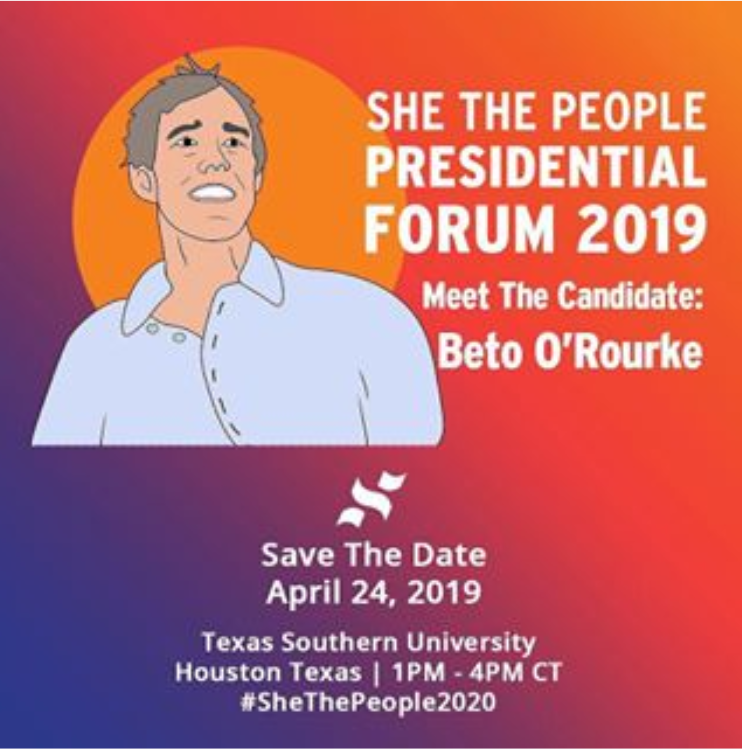 @TexasSouthern 1-4pm! She the People Forum, 1st women of color forum, invited all candidates, but only had 8 slots. Beto O’Rourke, Booker & Castro were the only ones who accepted the invite by 3/24. Well done, you three! Livestream: https://www.facebook.com/shethepeople1/#Beto2020pic.twitter.com/gexXluSVRN