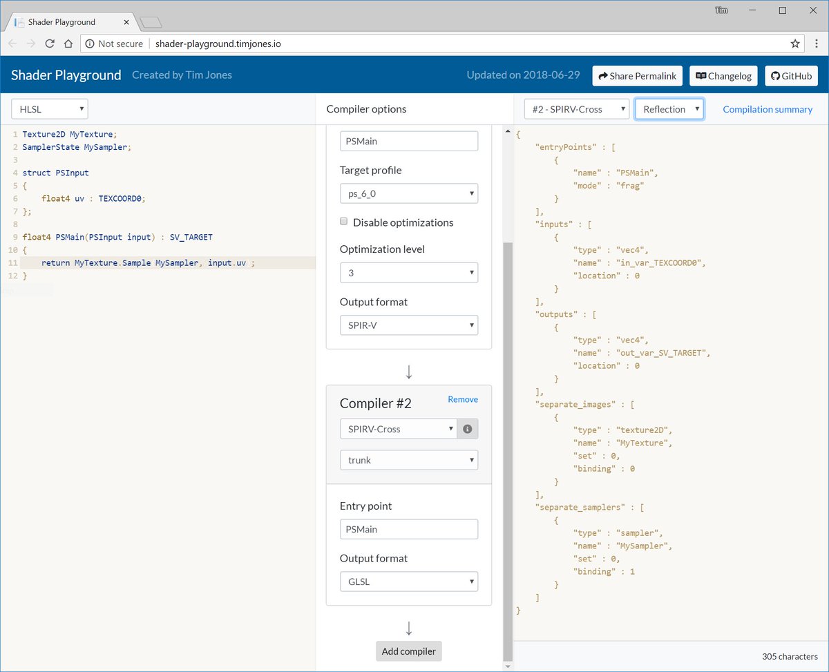 @VrDevBrad (just) added! Very useful for generating wrapper classes for your shaders. As always, try it here (you'll have to switch to the Reflection output manually): http://shader-playground.timjones.io/ed0fe4e938e5fb4b114337ed2ce55dc9 …pic.twitter.com/tMWsZxfb2u