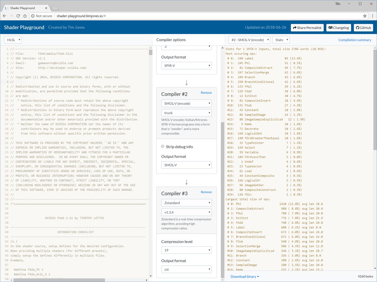 @aras_p's SMOL-V encoder for SPIR-V - SMOL-V would usually be paired with a post-compressor, so I've added zstd, zlib, lzma - "compilation summary" view so you can see # bytes at each step Try it: http://shader-playground.timjones.io/afd3aa1407136002d59da673dc0c7703 …pic.twitter.com/iELO4cHCjz
