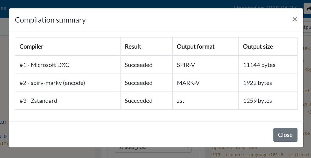I've added a second SPIR-V compressor to Shader Playground: this one is MARK-V, part of SPIRV-Tools. MARK-V codec source: https://github.com/KhronosGroup/SPIRV-Tools/blob/master/source/comp/markv_codec.cpp … Try it out here: http://shader-playground.timjones.io/4b2fcc877550f7fc133560882a236b69 …pic.twitter.com/kUxBeoWA3p