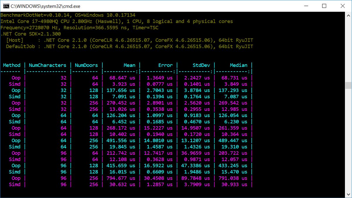 I'm working on a blog post about .NET Core 2.1's new SIMD intrinsics, porting the doors example from
